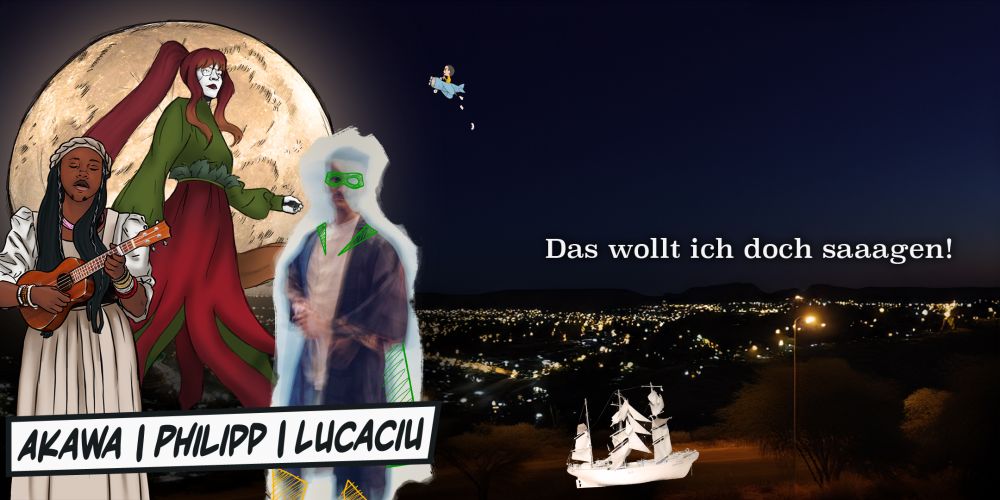 In den düsteren Straßen von Windhoek-City schleicht eine finstere Gestalt umher - der Schattenschleicher! Mit seinem schwarzem Umhang und den glühenden Augen ZISCH! verbreitet er Angst und Schrecken unter den Bürgerinnen und Bürgerinnen (so sagt es immer der dortige Oberbürgermeister). Doch drei mutige Superheroes stellen sich dem Schattenschleicher entgegen: Blackwave, Philippy Reed und Woody Giant! Da wäre zuerst Blackwave, die mit ihrer unscheinbaren Ukulele und ihrer reinen Stimme selbst den fiesen Schattenschleicher paralysieren kann DWEEWEEWEEH! Im bürgerlichen Leben ist Angelina Tashiya Akawa eine etwas schüchterne Reporterin beim Winhoek-Telegraph und mag gerne Droewors oder Biltong. Ganz anders Philippy Reed: während sie bei der Bekämpfung von Schurken eher auf stoische und leise Dauerimpulse setzt (damit kann sie - SQUEEEEZZZZ! Gegenstände aller Art zerspringen lassen, so, dass auch der Schattenschleicher nicht mehr schleichen kann), ist sie im Privatleben die dynamische Unternehmerin Theresia Phillip, die erfolgreich ein kleines Imperium an Naturkosmetikprodukten mit eigenem Influencer-channel führt. Und dann wäre da noch Woody Giant, der Naturmagier, dessen tieffrequente archaische Schallwellen dem Schattenschleicher auch noch Häuserblocks entfernt zu schaffen machen. Woody Giant verdient sich im „normalen“ Leben ein paar namibische Dollar als Robert Lucaciu; mit all seinen Brüdern betreibt er einen alteingesessenen Friseursalon. Er erfährt alle News der Stadt zuerst und gibt sie dann an Angelina und Philippy weiter… Als der Schattenschleicher Windhoek-City in Dunkelheit und Angst zu stürzen droht, eilen Blackwave, Philippy Reed und Woody Giant sofort zur Rettung! „AAARGH!“, „Gib’s ihm!“ „Nimm das hier!“ „BAM!“ Mit vereinten Kräften stellen sie sich dem bösen Schurken entgegen: „HEUTE SIEGST DU NICHT!“ Ein atemberaubender Kampf! Natürlich gelingt es dem harmonischen Trio, den Schattenschleicher elegant in die Flucht zu schlagen und das Licht der Hoffnung mithilfe von empfindsamer Musik und klug gesetzten Texten zurück in die Herzen der Menschen von Windhoek-City zu bringen. Zwar nix Berauschendes - aber Windhoek ist mal wieder gerettet!