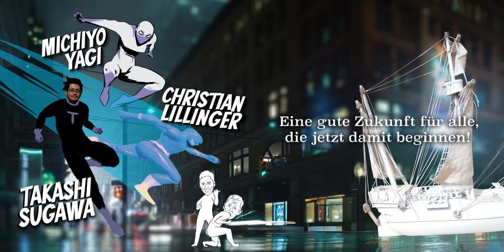 Um sich dem fürchterlichsten frauenverachtenden rechtslibertären islamfeindlichen Dreck und Abschaum in den sumpfigen Untiefen der Manosphere entgegenzustellen, haben sich drei absolute Ausnahmesuperheroes zusammengeschlossen: Nur dieses eine Mal. Und zwar ein für alle Mal. In Moers ist nämlich Schluss für den Menschenhändler und Vergewaltiger Andrew Tate und seinen Club der Verächtlichen: Für den neoreaktionären und antiegalitären Pay Pal Gründer Peter Andreas Thiel, den dissoziativ identitätsgestörten Elon Musk (dem vielleicht ganz einfach nur ein kleines i im Nachnamen fehlt - und alles wäre womöglich deutlich besser), den rechtsextremen Verschwörungstheoretiker Alex Jones oder den antisemitischen Verfechter straffreier Vergewaltigung Roosh V (alias Daryush Valizadeh). WHOOOOM! „Losertruppe!“ denkt sich Superheroine Michiyo Yagi nur, stellt ihre Electronics auf ‚Eliminieren‘ und feuert mikrotonale Tonsalven aus ihrer Basskoto, bei jedem frequenziellen Lichtblitz - FLASH! - justiert sie mit links die Schärfe nach - jeder Impuls ein Stich in die Chauvihirne. ARGH! Christian Flash Lillinger kaskadiert Trippel- und Quadruppelschläge mit Hyperraumgeschwindigkeit so gezielt und strukturiert, dass die Schurkenbande nicht einmal mehr orten kann, wann und wo die Schläge sie erwischt - bis alle völlig nackt am Boden kauern und mit der letzten Kreditkarte vor'm Gemächt zur Polizeiwache tippeln, um Anzeige zu erstatten. Doch Polizeiobermeister Takashi Sugawa zeigt der zerschundenen und verwunderten Zombietruppe erst einmal, dass man beim Basssolo zuhört (und nicht dazwischenquatscht). Ob es Zeugen gebe?… tja. Danach erklärt er ganz in Ruhe, wie man sich entschuldigt, hinten anstellt, sich für andere Menschen interessiert, erklärt ihnen in aller Seelenruhe die Begriffe Respekt, Demut, Armut, Verantwortung - und dass Musik die Kraft hat, direkt die Seele zu erreichen - sogar in den hoffnungslosesten Fällen. Just in dem Moment fährt an der Asberger Straße, also wirklich direkt vorm Polizeipräsidium, eine prächtige weiße Segelyacht vorbei: Von Bord winkt der berühmte niederrheinische Heimatdichter Hanns Dieter Hüsch die obskuren Gestalten zu sich, signalisiert POM Sugawa, dass das schon so in Ordnung sei und ruft: „Eine gute Zukunft für alle, die jetzt damit beginnen!“ Allgemeines Staunen. „Segel setzen! Kurs auf Guantanamo!“ HYSH!