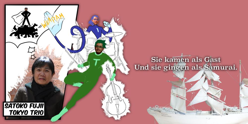 Wenn die ultranationalen Uyoku-Dantai* mal wieder mit ihren Gaisensha** durch die Straßen dröhnen und die Menschen einschüchtern, eilt die Satoko Fujii Tokyo Gilde herbei und beschützt die Bürgerinnen und Bürger im Großraum Tokio. Und sie tut dies extrem lässig und intelligent - manchmal wirkt die Gilde der drei Megahelden beim Erledigen der braunen Brut fast ein bisschen arrogant. So spielt Ittetsu Takemura meist noch mit drei Extremitäten weiter Schlagzeug (das ist sein großes Hobby; im wahren Leben arbeitet er als Superherobüsten-Modellierer bei Toy Sapiens in Shibusa), während er mit der linken Hand (sie ist seit einem Chamäleonbiss aus seiner Kindheit zu unglaublicher Elastizität fähig) die blöden Uyoku-Typen in ihren SUVs arhythmisch zur laufenden Marschmusik ohrfeigt - PATSCH! P-P-P-P-PATSCH! Takashi Sugawa ist da noch entspannter: Er hört, die Augen geschlossen, einfach auf seine Freunde, holt mit seinem Lichtbogen die unglaublichsten Frequenzen aus seinem alten Bass und leitet die gespielte Energie in Schrumpfungsenergie um, mit der er die militärgeilen Nationalisten zu kleinen mäuschengroßen Witzfiguren schrumpft. Komisch: Das passiert immer, wenn er ein Bassolo spielt. Vielleicht, weil er als Jugendlicher in einem Tokioter Jazzclub wohl mal von einer berauschten Maus während eines Basssolos von Peter Kowald gebissen wurde - GRMPF! Und während die ganze Zeit über die Gaisensha in Flammen aufgehen und die rechten Aktivisti mausgroß in die Kanalisation flüchten, schreibt die bescheidene Meisterin Satoku Fujii gerade mit rechts an einer Rede über die Liebe zur Musik, weil nur die wahre und reife Musik zu tieferen Gefühlen und Ideen führen kann und weil sie Nationalität, Geschlecht, Generationen oder Religionen überwinden kann. Mit der linken schreibt sie parallel an Arrangements für ein größeres Jazzensemble (manche nennen sie auch „die Ellington des Freejazz“). Dabei arbeitet sie eigentlich nachts in einem kleinen Online-Übersetzungsbüro als beglaubigte Kisaragi / Esperanto - Translaterin, wo sie definitiv unterfordert ist. GÄHN. Zum Glück ist Satoku Fujii mit der Gabe der Apportation*** gesegnet: So kann sie nebenbei auch ein bisschen Spaß mit den Uyoku machen - warum auch nicht? Das Leben ist kurz. Deshalb jetzt mal abgekürzt: Nach dem das Tokioter Terzett den Großraum Moers über Pfingsten lässig von der Freien Fraktion**** befreit hatte, wurde ihnen die goldene Schutzfink-Plakette der Stadt vom großen Ehrenbürger verleihen „Sie kamen als Gast und sie gingen als Samurai."