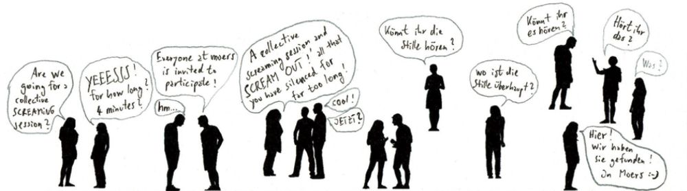 Die Stille bahnt sich ihren Weg. Sie schleicht sich an … Spitzt die Ohren. Lauscht! Wir präsentieren euch: Die Stille. Eine verdächtige Stille legt sich über die Stadt (und lädt euch ein, genau hinzuhören!). Ein Film über die Stille in Moers, echt? Vielleicht ist sie da, wo ihr sie nicht erwartet. Vielleicht hört ihr diesmal etwas gaaaanz anders. (oder gerade Nichts!). Und irgendwo, ganz leise, klingt vielleicht noch ein Vers nach: (von Mascha Kaléko) “Meine Sehnsucht verstummte, mein Lied ist verweht.” … müsst alle kommen, wenn ihr euch traut, die Stille zu hören. Jetzt. Vielleicht. You!: The Festival Audience! “Are we going for a collective screaming session?” “YEEESSS! For how long? 4 minutes?” “Everyone at moers is invented to participate!” “hm …” “A collective screaming session and SCREAM OUT! all that you have silenced for far too long!” “Cool!” “Jetzt?” “Könnt ihr die Stille hören?” “Wo ist die Stille überhaupt?” “Könnt ihr es hören?” “Hört ihr das?” “Was?” “Hier! Wir haben sie gefunden! In Moers”